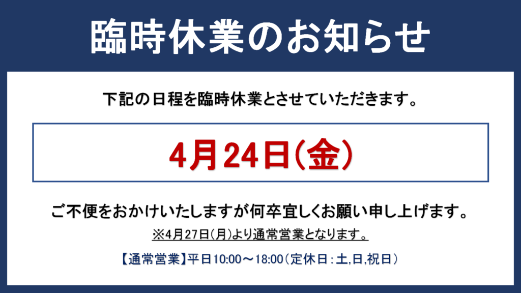 この度、下記日程を社員研修のため臨時の休業日をお知らせいたします。